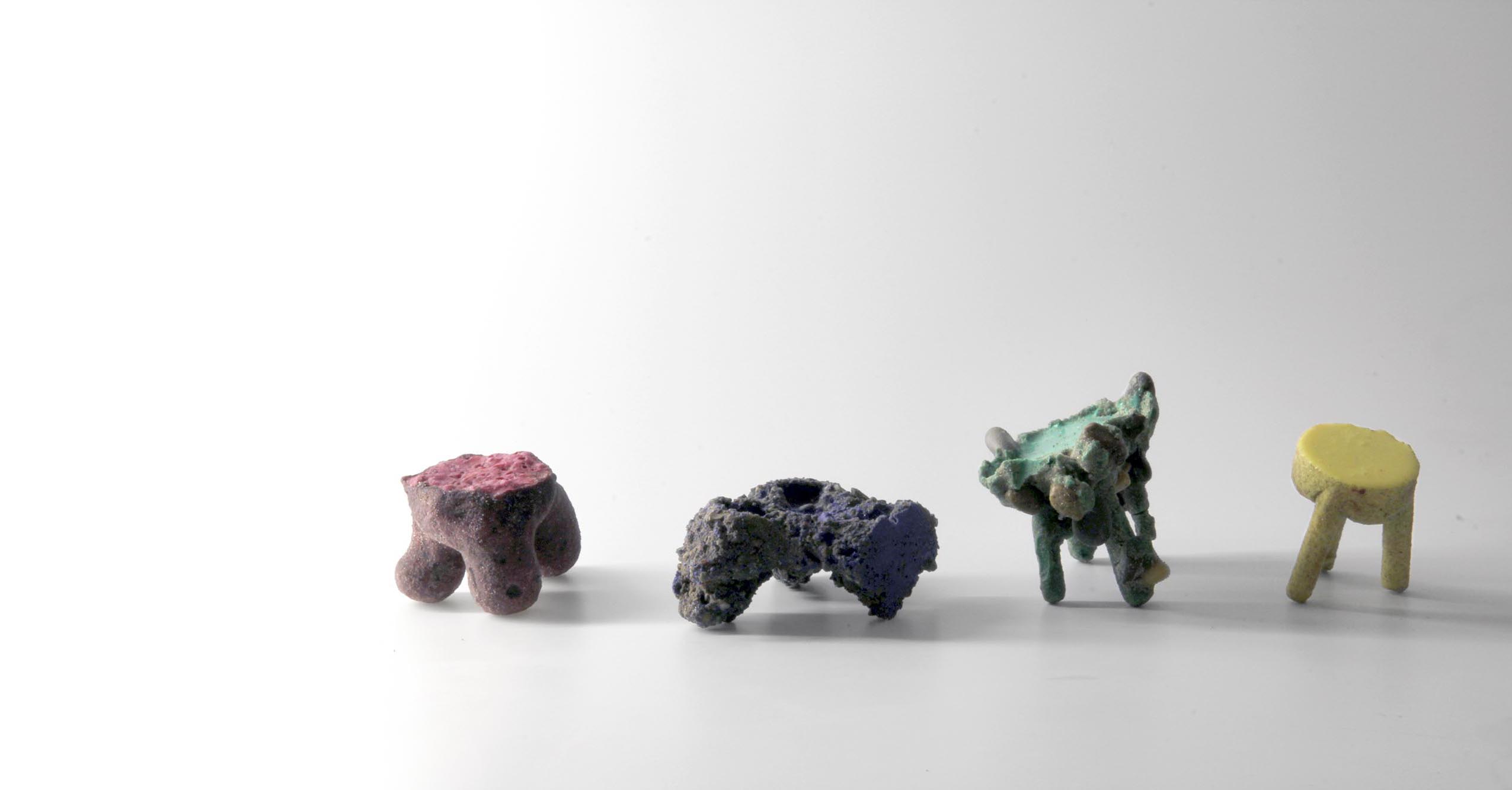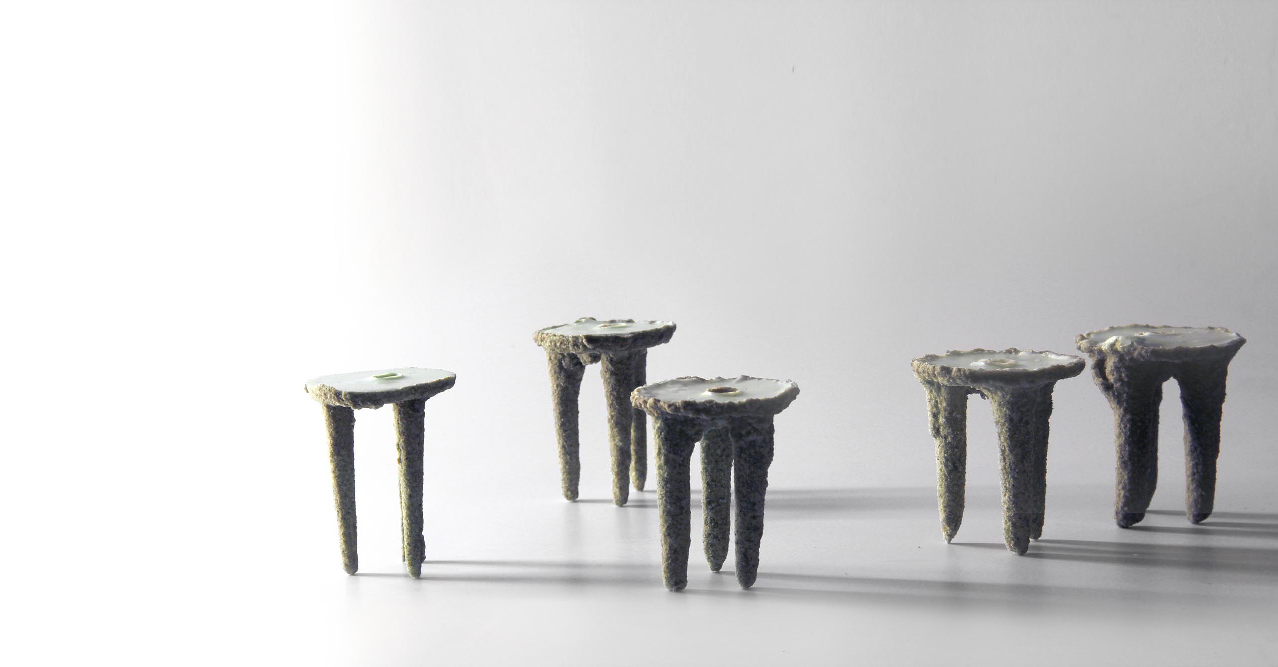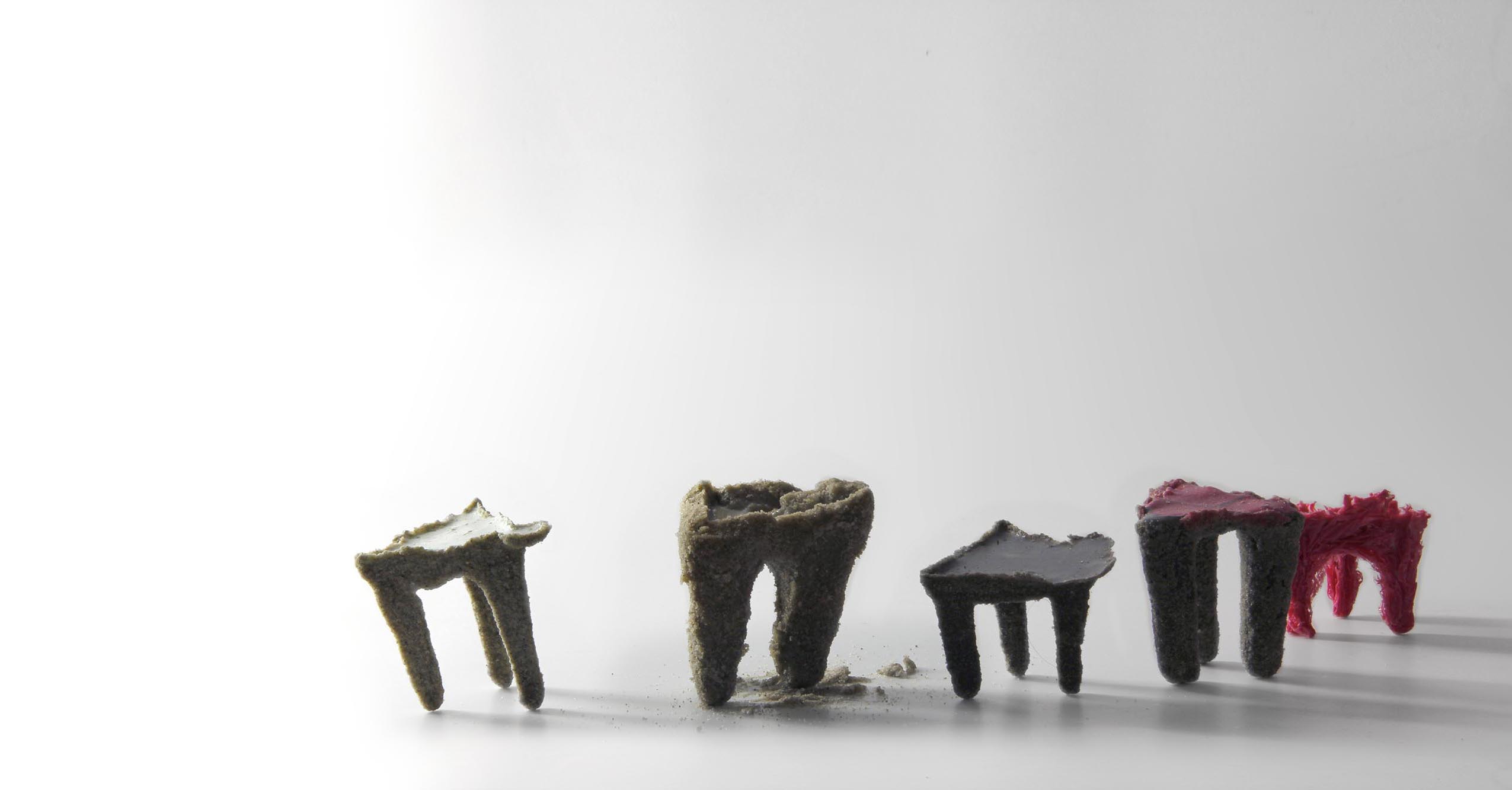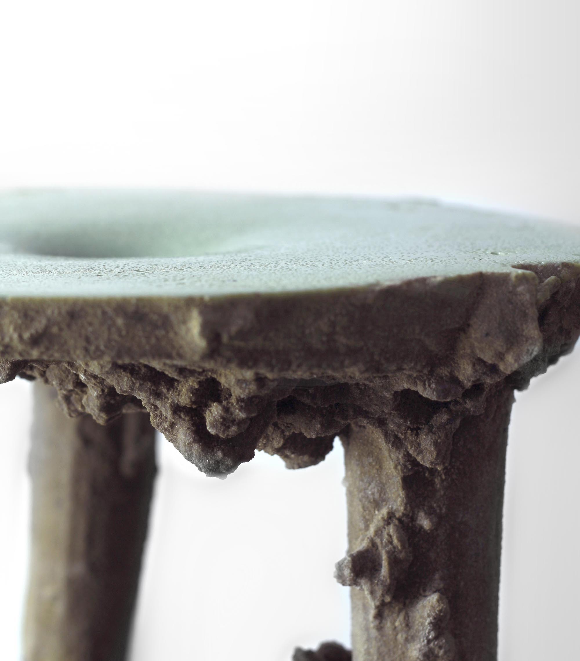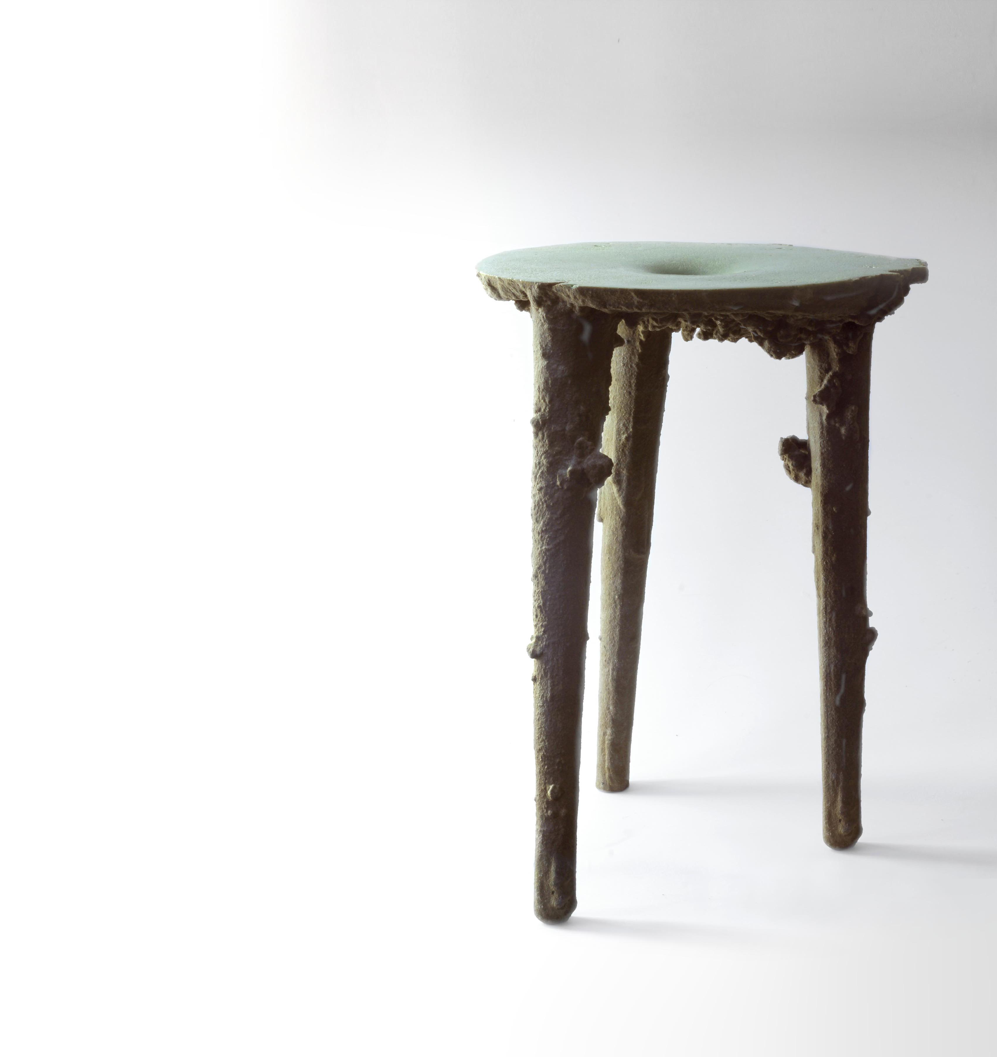 The whole details of the product and its evolution is then based on the natural notion of entropy, offering to every pieces its unicity and creating a continuity in the collection. This system allows the details to increase and to become shapes. As if the stool itself was growing in the earth. material: G27 Polyurethane / Vegetal oil / Sand